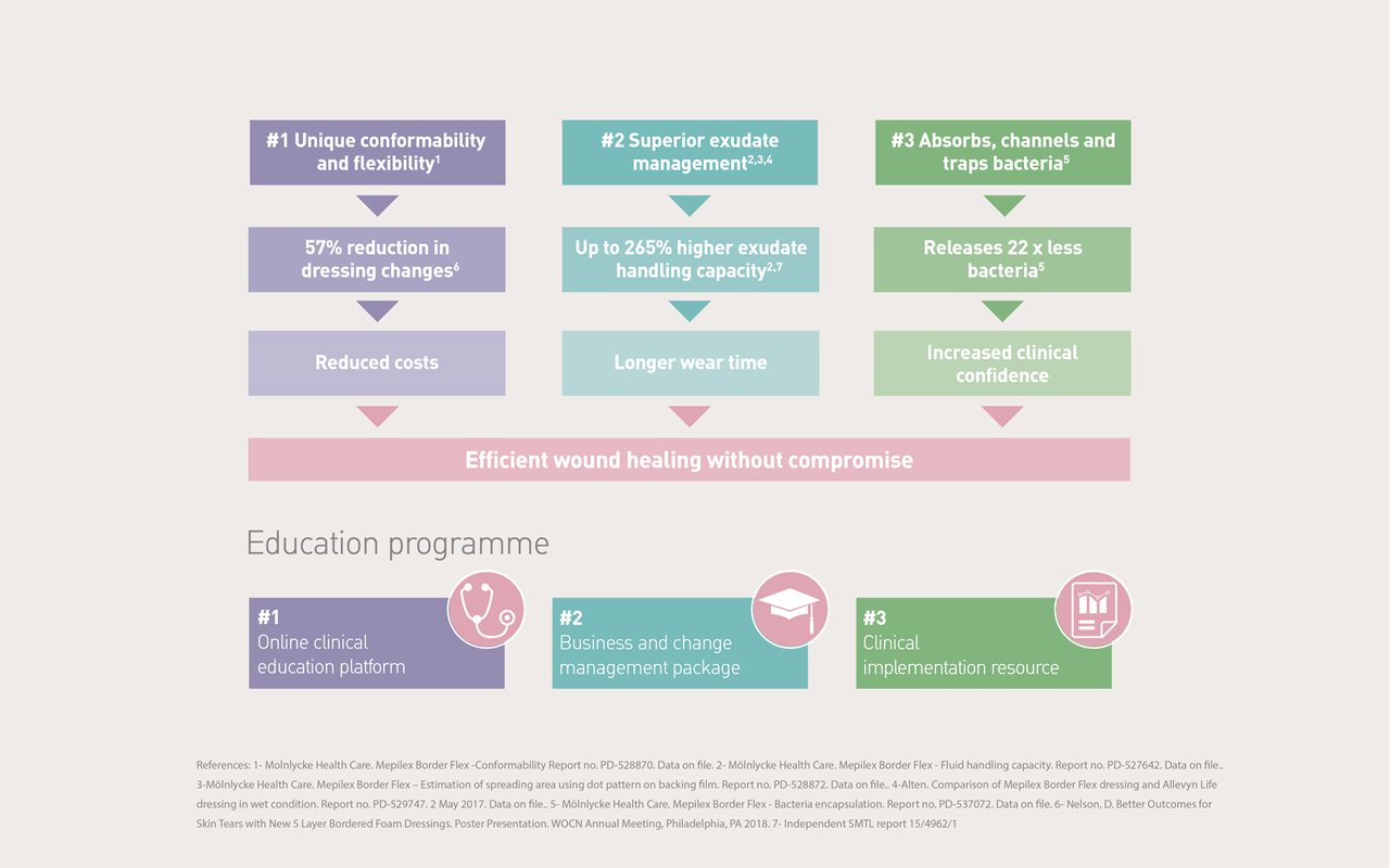The patent-pending design combines Flex Technology with Safetac® technology in the wound contact layer to reduce pain and trauma while helping the dressing to stay on